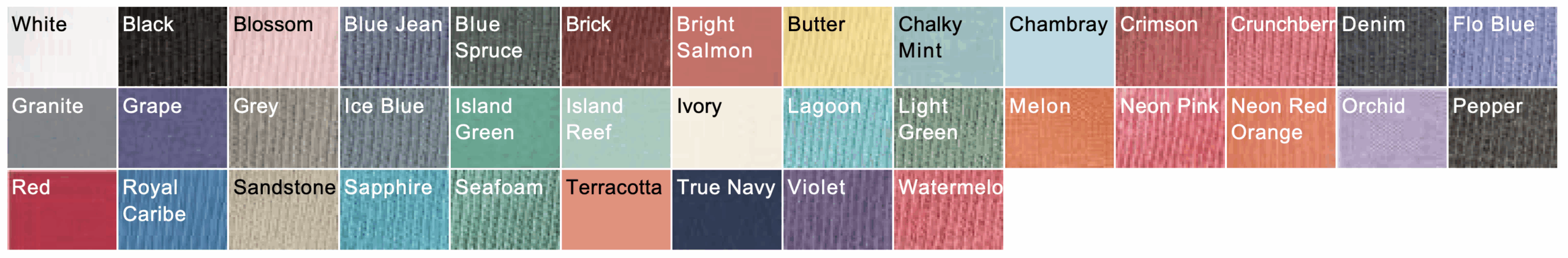 Pigment dye colors: These colors provide a vintage look that will remain for the life of the garment. Pigments are insoluble color particles attached to the surface of cloth using a binding agent. Reactive dye colors: Provide a traditional dyed appearance, with the same great softness.