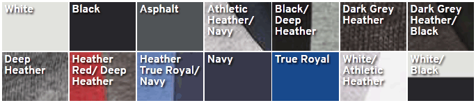 | Color | Asphalt, Athletic Heather & Navy, Black, Black & Deep Heather, Dark Grey Heather, Dark Grey Heather & Black, Deep Heather, Heather Red & Deep Heather, Heather True Royal & Navy, Navy, True Royal, White, White & Athletic Heather, White & Black |