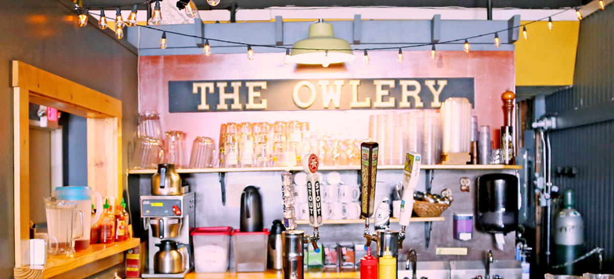 The Owlery is located at 118 W 6th Street, right on the Courthouse square.